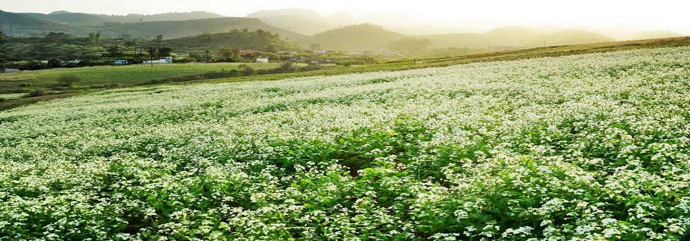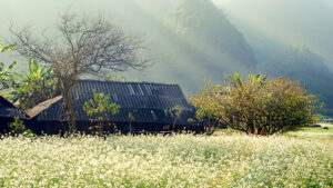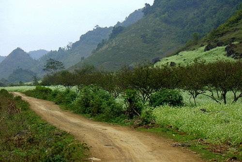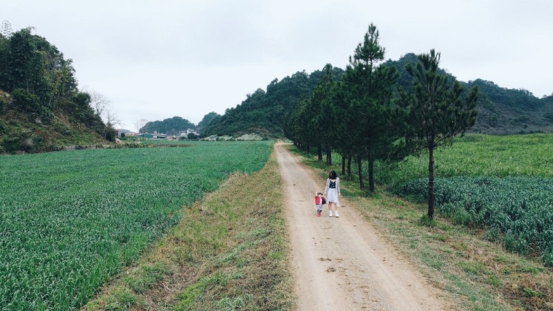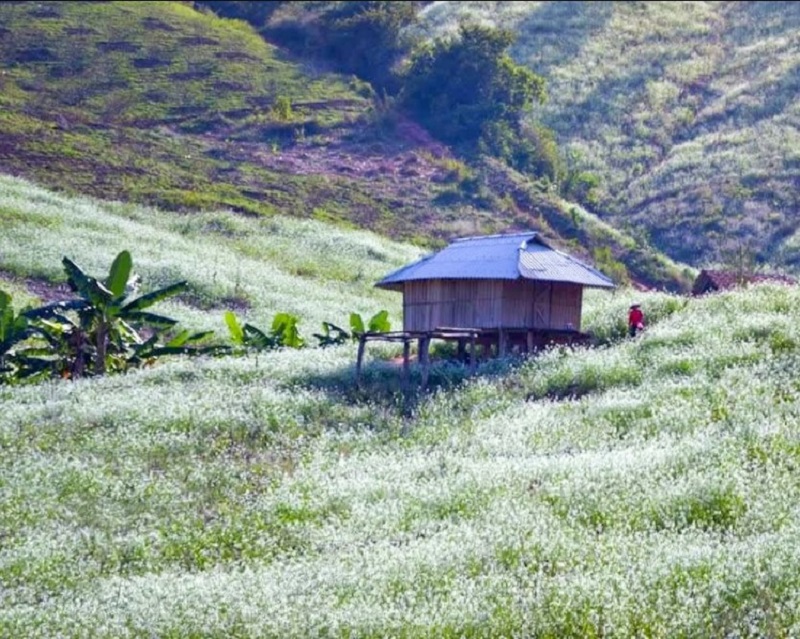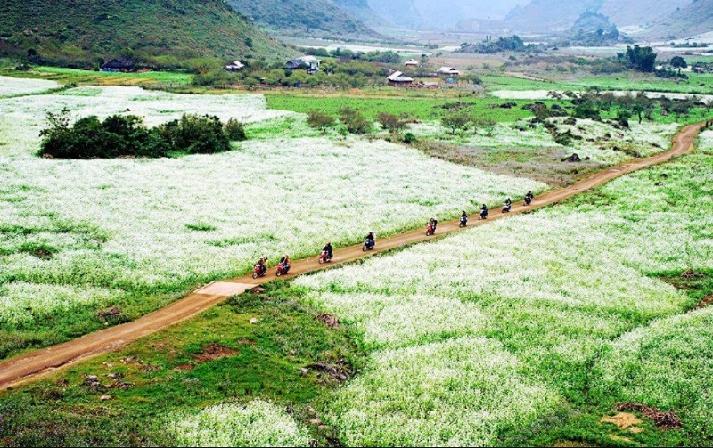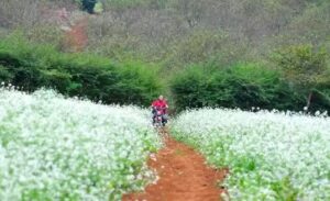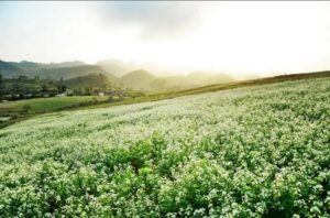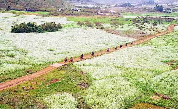 The road to Thung Cuong Moc Chau village is a dirt road with two sides are fields of ecstatic white canola flowers. The pure white color covering the two sides of the road under the gentle sunlight becomes sparkling like glowing. Surely you will not be able to help but stop in the middle of the road, silently admiring the rich and poetic beauty that the scenery here brings. The honey-brown winding road is lost in the valley of white canola flowers. What a beautiful picture for any visitor. This is also a favorite check-in photo spot for young people.