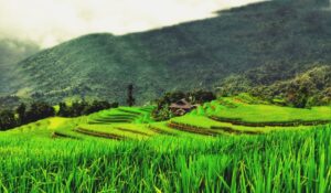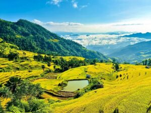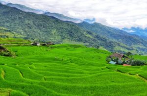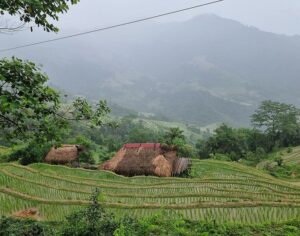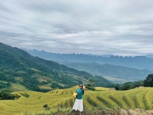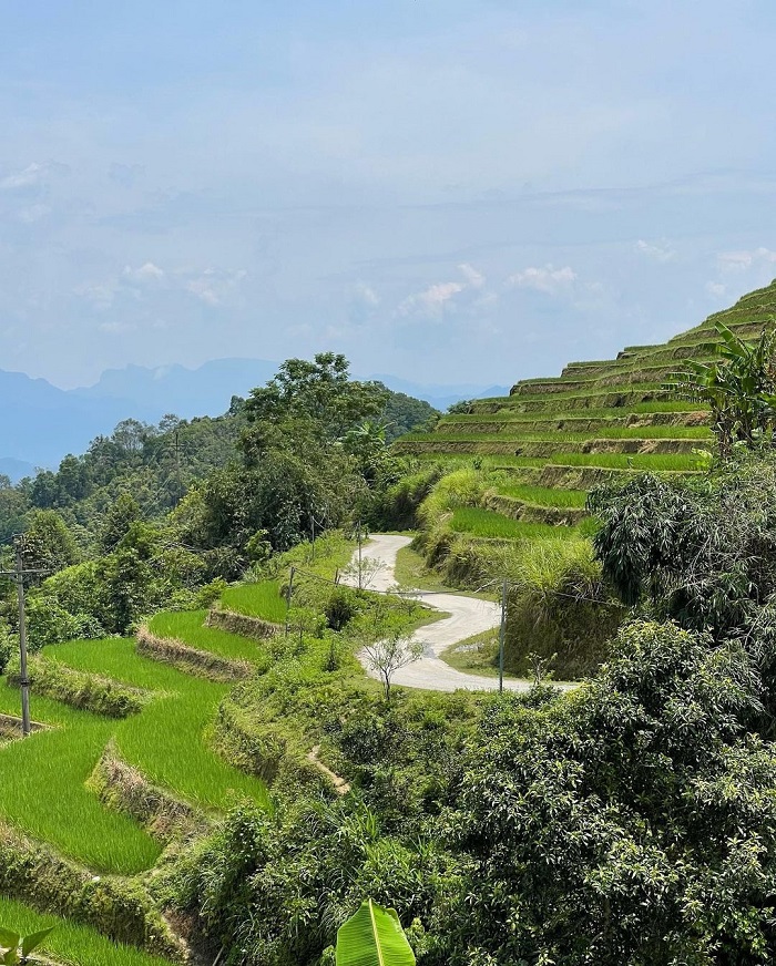 Because it is located in a high terrain, when walking in this village, visitors will feel the cool and pleasant atmosphere. Partly thanks to the high terrain, partly thanks to the mountains and vast rice fields here. In Khuoi My village, people plant terraced fields along the mountainside to the valley, everywhere is a green color of new rice.