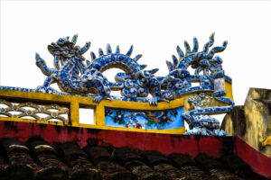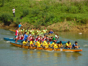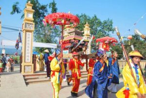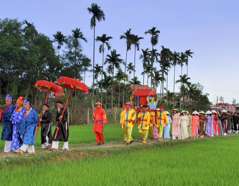 • This festival featured solemn rituals, including a procession of deities, a royal honour ceremony to confer diplomas, and floating lanterns in the river. In addition, various folk games were organized during the festival, including tug of war, rice paper grilling, Tet (cylindrical glutinous rice) cake-making competitions, and Bai Choi (singing while acting as playing cards) folk singing performance. In particular, this event also featured a number of exciting activities such as a human chess competition, “Ho Khoan” (a genre of Vietnamese folk music, a boat race, and a traditional food contest.