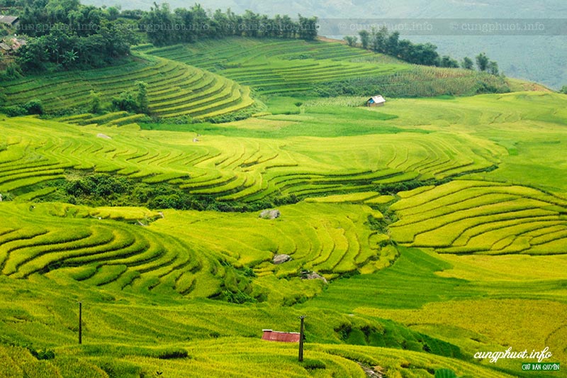 The terraced fields here have a unique beauty, a golden color that cannot be found anywhere else. According to local people, the fields here are transplanted with local rice varieties, so they have a natural golden luster, which can be said to be the most golden in Lao Cai. The terraced fields here are located right on the road to Y Ty, so it is quite convenient for taking pictures.